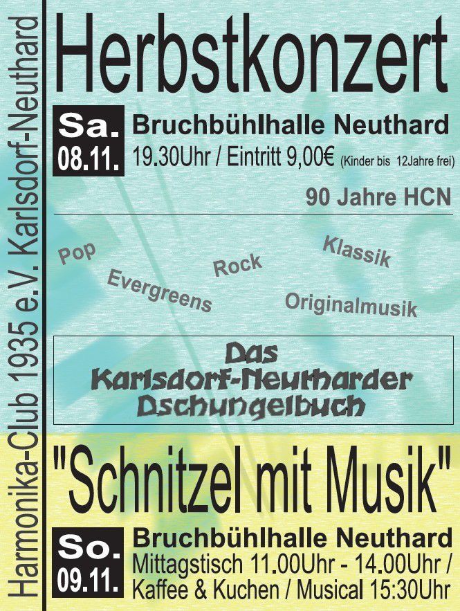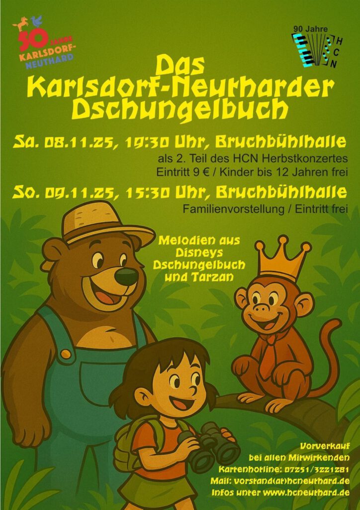 In diesem Jahr feiert der Harmonika-Club 1935 e. V. sein 90-jähriges Jubiläum und die Gemeinde Karlsdorf-Neuthard begeht ihr 50-jähriges Fusionsjubiläum. Aus diesem doppelten Grund haben wir ein eigenes, kleines Musical geschrieben: Das Musical „Karlsdorf-Neutharder Dschungelbuch“. Die Aufführungen finden im Rahmen unseres Herbstkonzerts und des Herbstfests am 8. und 9. November 2025 in der Bruchbühlhalle statt.